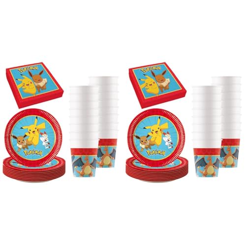 Procos - Décoration d'anniversaire Pokemon, 52 pièces, assiettes en carton, gobelets et serviettes pour anniversaire d'enfant, vaisselle de fête (Lot de 2)