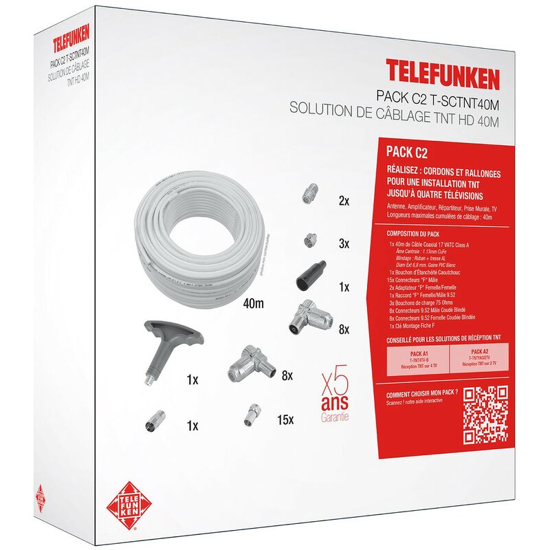 Pack de câblage tnt hd pour tv avec cable antenne 17VTAC longueur 40m et connectique 'f' C2 Telefunken T-SCTNT40M