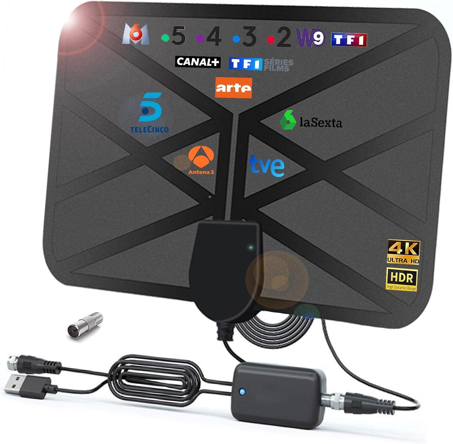 Antenne TV Puissante TNT HD, Antenne TV Intérieure avec Amplificateur de Signal à Gain Élevé,Réception Longue Portée à 360°de Plus de 560 Miles,Supporte 4K 1080P et Toutes les Chaînes de Télévision