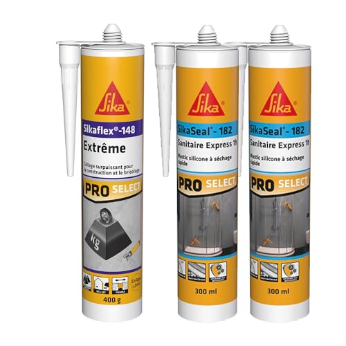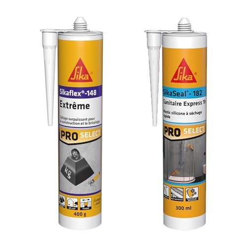 SIKA - Colle polyuréthane puissante - Pour fixation d'objets lourds - Intérieur et extérieur -Blanc -300ml + Mastic Silicone spécial salle de bain, cuisine et douche - Anti-moisissures - Blanc - 300ml