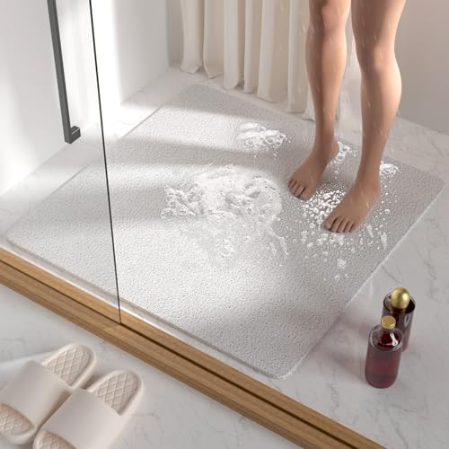 HITSLAM Tapis de Douche Antiderapant, 60x60cm Tapis de Baignoire Antidérapant avec Drain, Doux PVC Luffa Tapis de Bain pour Salle de Bain, Séchage Rapide, Blanc
