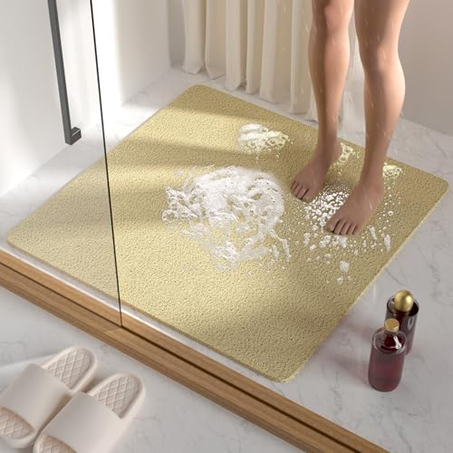 HITSLAM Tapis de Douche Antiderapant, 60x60cm Tapis de Baignoire Antidérapant avec Drain, Doux PVC Luffa Tapis de Bain pour Salle de Bain, Séchage Rapide, Beige
