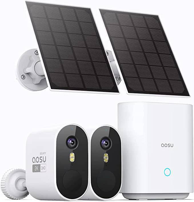 Aosu 2K Caméra Surveillance WiFi Extérieure sans Fil, Solar Security Cameras Kit, Base+2 Cam, sans Abonnement - Enregistrement Local, Angle de Vue 166°, Vision Nocturne, Détecteur de Mouvement, IP65