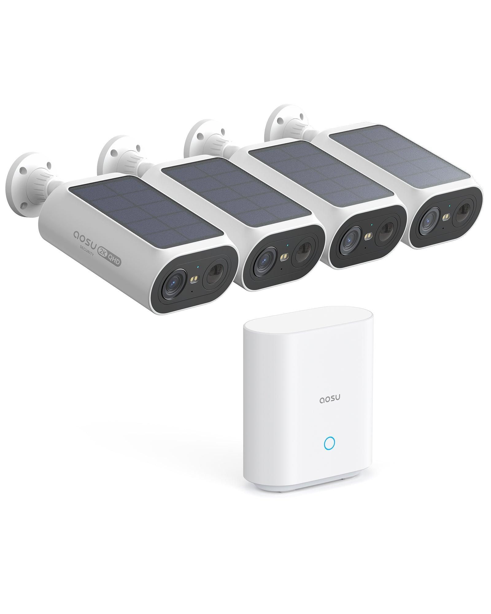 Aosu 2K Caméra Surveillance WiFi Extérieure sans Fil, Solar Security Cameras Kit, Base+4 cam, sans Abonnement - Enregistrement Local, Angle de Vue 166°, Vision Nocturne, Détecteur de Mouvement, IP65