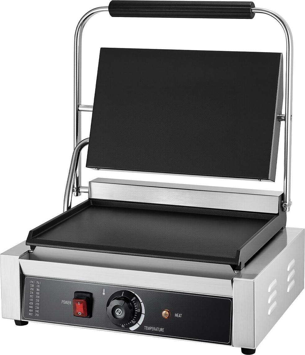 Grill à panini commercial, appareil à sandwichs et paninis électrique 2200 W, presse à sandwichs en acier inoxydable avec poignée et contrôle de la température, plaque émaillée entièrement plate de 34 x 23 cm, pour hamburgers, steaks et bacon.