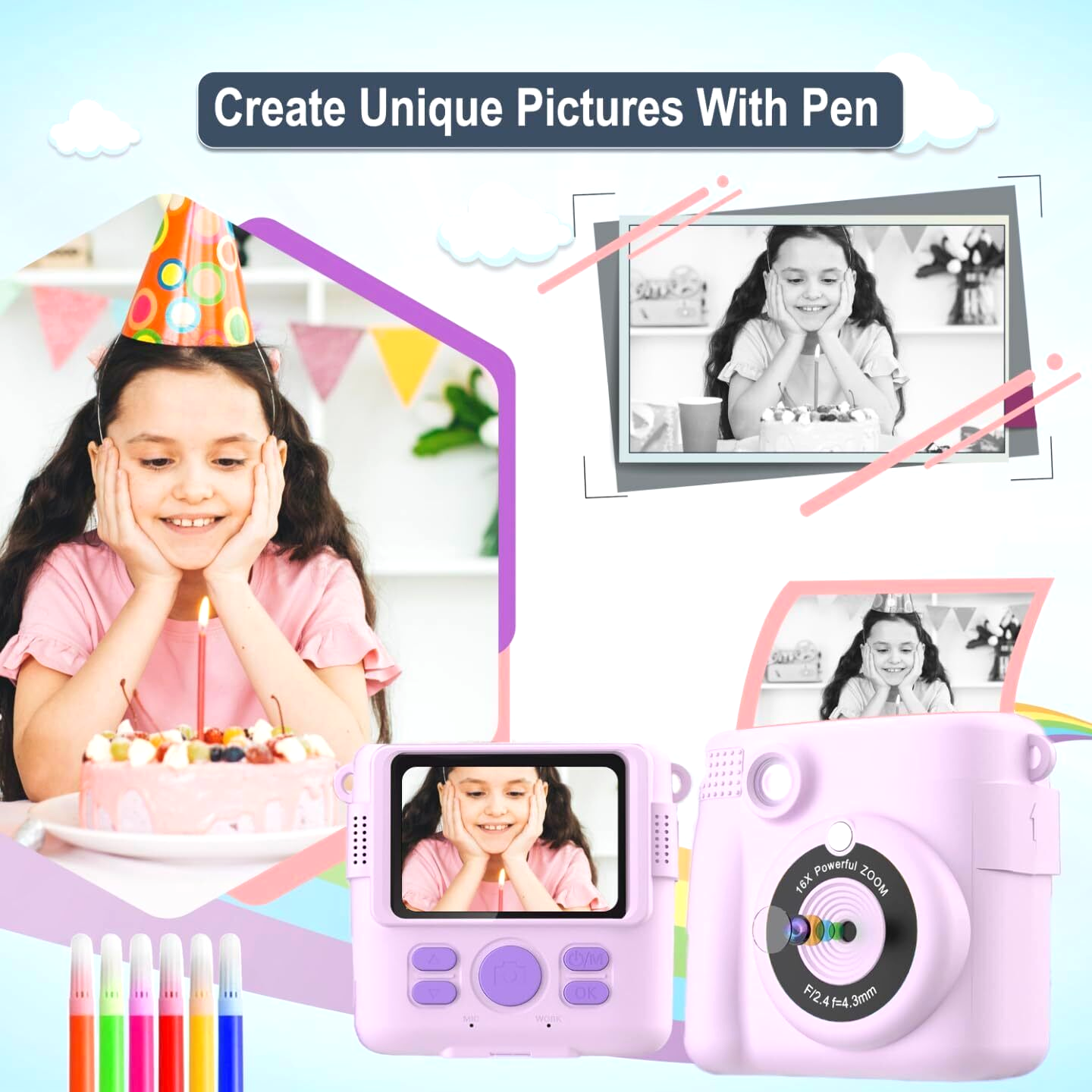Ushining Appareil Photo à Impression Instantanée pour Enfant, Appareil Photo Numérique avec 2,4 Pouces écran Carte TF 32 Go 3 Rouleaux de Papier à Imprimer, Cadeau pour Filles Garçons de 3 à 12 Ans