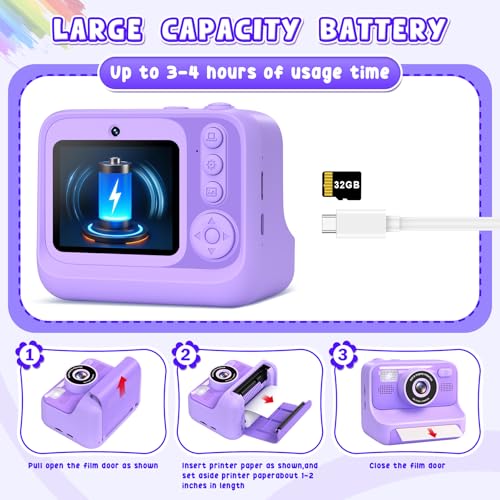 Hangrui Appareil Photo Instantané Enfant, 2,0 Pouces Écran HD Appareil Photo Enfant avec Carte de 32GB & 3 Rouleaux de Papier d'impression,Cadeau Jouet pour Enfant Garçons Filles de 3-10 Ans -Violet
