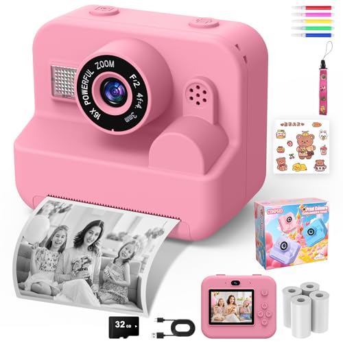 Appareil Photo Instantané Enfants, 1080P HD Appareils Photo Numériques Instantanés, 2.4'' Écran Appareil Photo Enfants avec Papier d'impression & Carte 32GB, Cadeau pour Filles Garçons 3-12 Ans