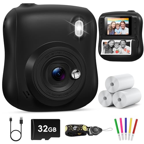 Hangrui Appareil Photo Instantané Enfant, 2,0 Pouces Écran HD Appareil Photo Enfant avec Carte de 32GB & 3 Rouleaux de Papier d'impression,Cadeau Jouet pour Enfant Garçons Filles de 3-10 Ans -Noir