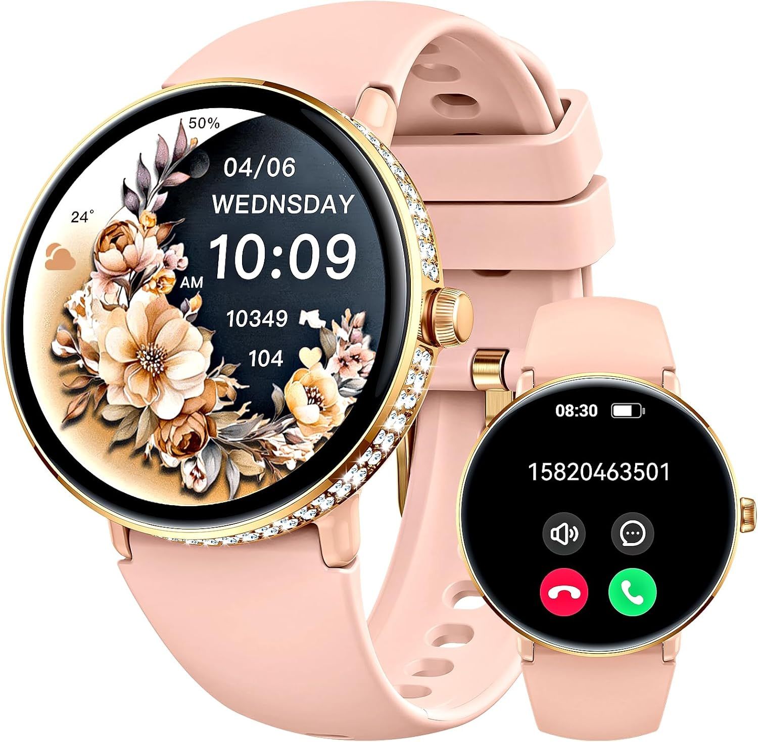 Montre connectée pour Femme avec Diamants 1,2"" AMOLED Fitness Tracker avec appels, Montre numérique avec 100 Sports, SpO2 / Cardiofréquencemètre étanche Smart Watch pour iOS Android (Or Rose)
