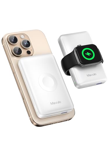 Mavulo Batterie externe magnétique 12 000 mAh, chargeur portable sans fil avec chargeur iWatch, 20 W USB C à charge rapide pour iPhone 16/15/14/13/12, Apple Watch (blanc)