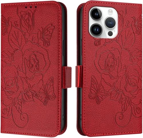IMIRST Apple iPhone 15 Pro Étui Flip Wallet étui de Téléphone PU Cuir Mandala Embossé Housse Antichoc avec Kickstand Porte-Carte pour Apple iPhone 15 Pro. LD Mandala Red