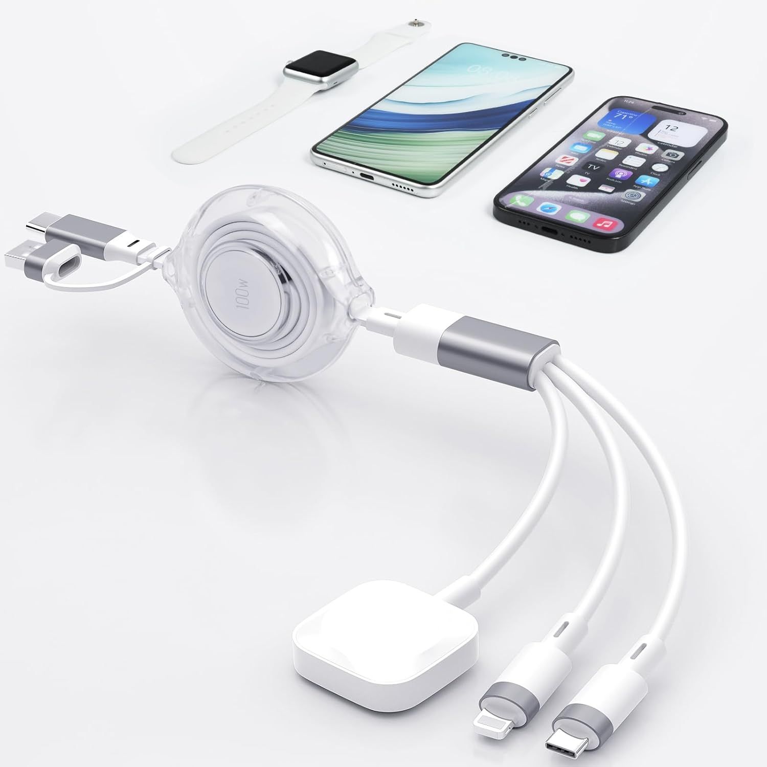 aceyoon 3 en 2 Cable Multi USB Rétractable, 1.2M Chargeur Magnétique pour Apple Watch Cable USB Multi Embout avec Lighting/USB C pour iPhone 16/15 Galaxy S24 S23 Huawei P60 P50