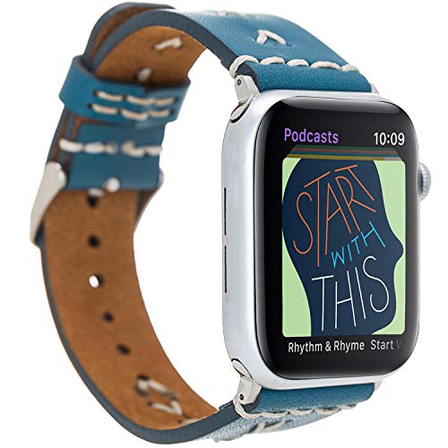 VENTA® Bracelet de rechange en cuir véritable pour Apple Watch 1/2/3/4/5 compatible avec Apple Watch Bracelet de rechange en cuir véritable (42-44 mm / bleu pétrole / VA12-BRN4) + kit d'adaptateur argenté