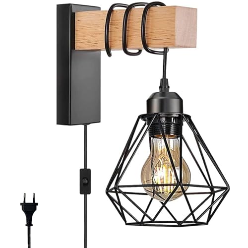 ELINKUME Applique Murale Intérieure en Bois avec Prise et Interrupteur,E27 Applique Industrielle avec Abat-Jour Cage Métallique Pour Chambre,Couloir Eclairage Décoratif Applique Murale(Sans Ampoule)