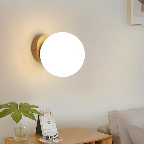 Tealight Applique Murale Intérieure Bois, Lampe Murale Abat-jour en Verre, Lumiere Murale interieur Boule E27, pour Chambre Salon Couloir Café Décoration Intérieure (Ampoule Non Incluse)