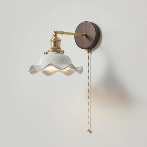 Applique murale de chevet en céramique de style japonais avec interrupteur à tirette Applique murale de chambre à coucher rétro en noyer Lampe murale moderne nordique en cuivre à bras droit pour coul