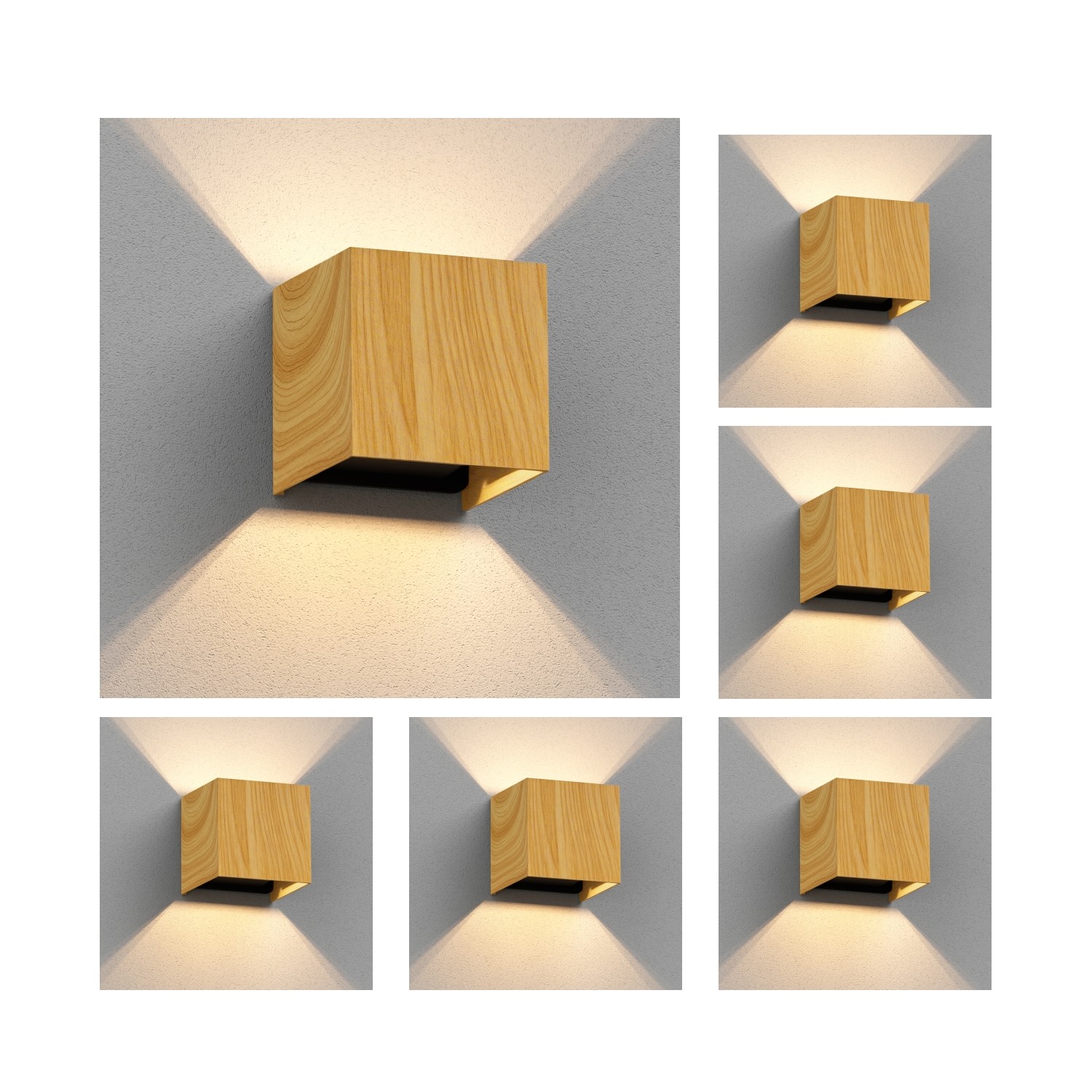 ledscom.de 6 pièces Applique murale CUBEL pour l'extérieur, IP65, up/downlight, aspect bois, carré, lampe LED incluse, 4,1 W, 501lm, blanc chaud