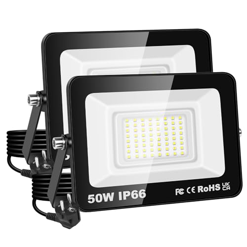 PICAA Projecteur LED 50W, étanche IP66, éclairage de sécurité 5000 lm, applique murale extérieure blanc froid 6500K pour jardin, cour, garage, terrasse, entrepôt, avec prise UE (2 pièce)