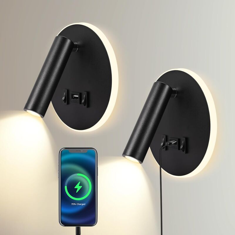 ERWEY 2pcs Applique murale LED, liseuse de chevet avec interrupteur, port de charge USB, 3W liseuse de lit pivotante à 360° avec prise et câble pour chambre, 3000-6000K, Noir
