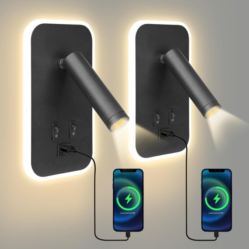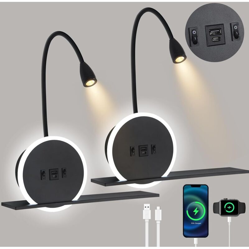 LED Liseuse de chevet 2 pièces, lampe murale avec interrupteur,Lampe de Lecture avec port de charge USB + Type C, 3W 3000K + 9W 6000K applique tete