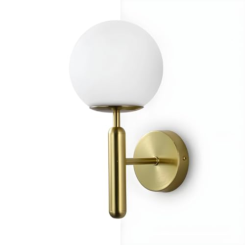 EKSED Applique murale en boule de verre blanc de 150 mm, globe en verre blanc avec applique murale à base en laiton doré (Or)