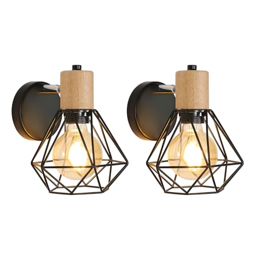 Toolight Lot de 2 Applique Murale Industrielle Vintage, 360° Réglable Lampe Murale en Bois, Luminaire Murales Cage E27 en Métal et Fer pour Chambre à Coucher Couloir Salle de Séjour Max 60W, Noir