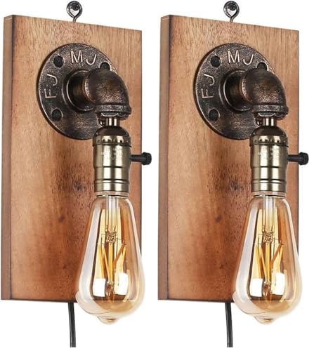 B·LED BARCELONA LED BarcelonaLED Applique Murale Vintage Industrielle Bois Pendentif Poignée avec Bouton Interrupteur et Prise de Cordon pour E27 Ampoule Salon Chambre Lit (Lot de 2)