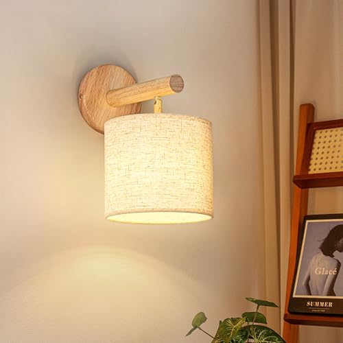 Gleonlux Applique Murale Intérieur Vintage, Applique Murale Bois Industrielle E14, Lampe Murale Rétro abat-jour en tissu, Appliques pour Chambre Couloir Salon Escalier,Ampoule Non Incluse, Lin