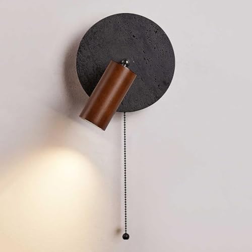 QTANZIQI Lampe de Lecture Murale Noire réglable, veilleuse LED du Milieu du siècle, Applique Murale en Pierre Naturelle, chaîne de Traction, Lampe Murale rotative en Bois de Ferme pour Chambre à