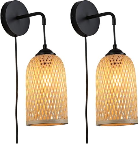 B·LED BARCELONA LED Applique murale avec prise en osier bambou rotin avec câble interrupteur culot E27 pour lumière intérieure table de chevet salon chambre LM164-P (Lot de 2)