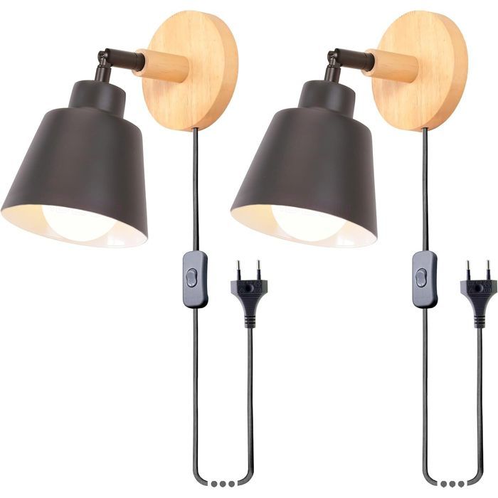 Applique murale LED avec prise européenne en métal et bois - Veilleuse moderne 220 V - Câble de 1,6 m - Culot E27 - Lampe de lecture pour couloir, café, loft bar,Ampoule non incluse (Noire couleur)