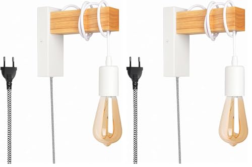 B·LED BARCELONA LED BarcelonaLED Applique murale avec câble interrupteur et prise Suspension en bois naturel Douille E27 Blanc Style vintage Rétro nordique (Lot de 2)