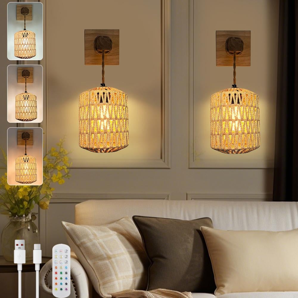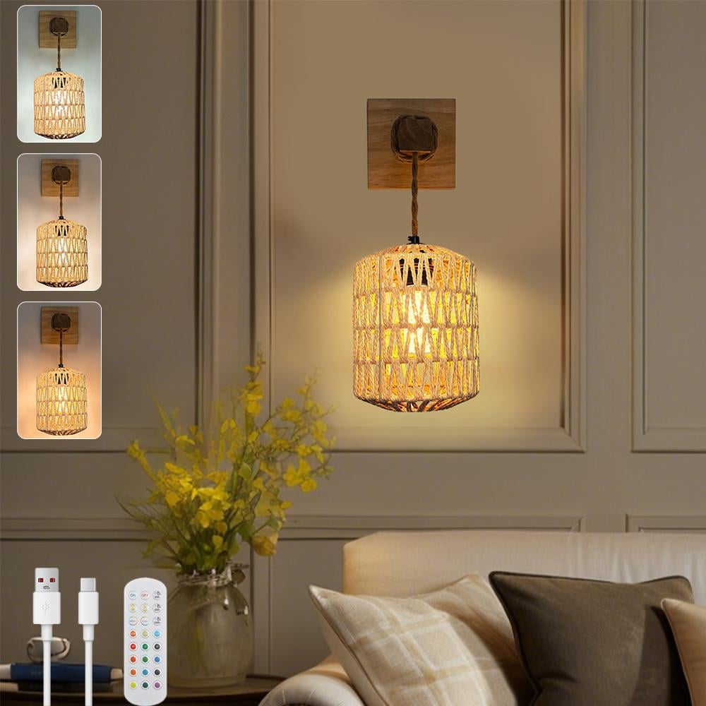 DTSDWA Applique murale LED sans fil Boho avec télécommande RVB à intensité variable - Lampe de chevet vintage en rotin pour chambre à coucher, salon, escaliers, couloir