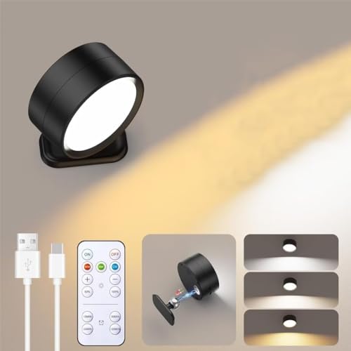 MEKKLEON Applique murale LED avec télécommande, appliques murales sans fil avec batterie rechargeable, 3 températures de couleur et intensité variable, rotation à 360°, appliques murales sans fil pour
