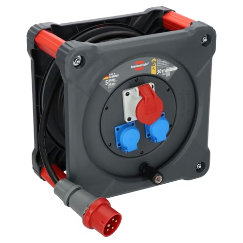 Brennenstuhl Professional KD 3200 C1 Enrouleur de câble de chantier avec prise CEE, prise CEE et 2 prises murales de protection (câble de 30 m en noir, utilisation permanente en extérieur, fabriqué en
