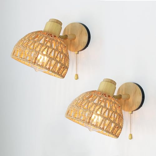 Applique murale en rotin avec interrupteur à chaîne, lampes en rotin pour chambre à coucher, appliques murales de ferme, luminaire mural d'intérieur, appliques murales de chevet bohème pour salon