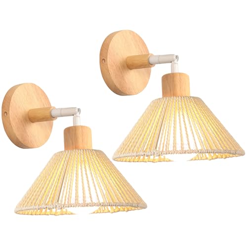 LIGKIN Lot de 2 Appliques Murales Interieures E27 Lampe Murale en Rotin Vintage Luminaire Applique Bois Réglable Lampe de Mur avec Interrupteur pour Chambre Salon Couloir