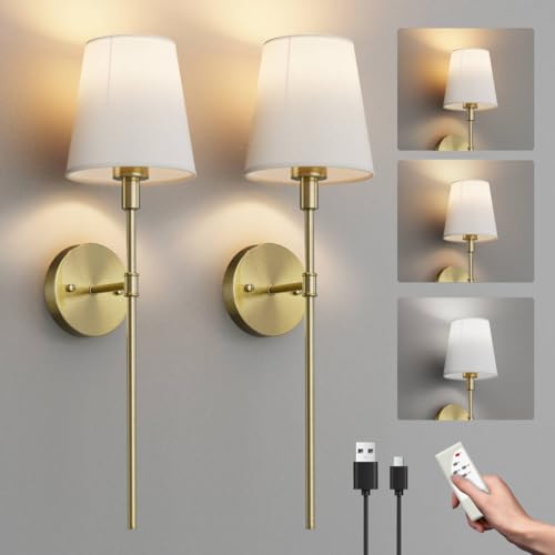 Aipsun 2 PCS 5500mAh Applique murale à piles avec abat-jour en tissu blanc,dimmable,Appliques murales sans fil avec télécommande,pour chambre à coucher,salle de bain,salon(Doré)