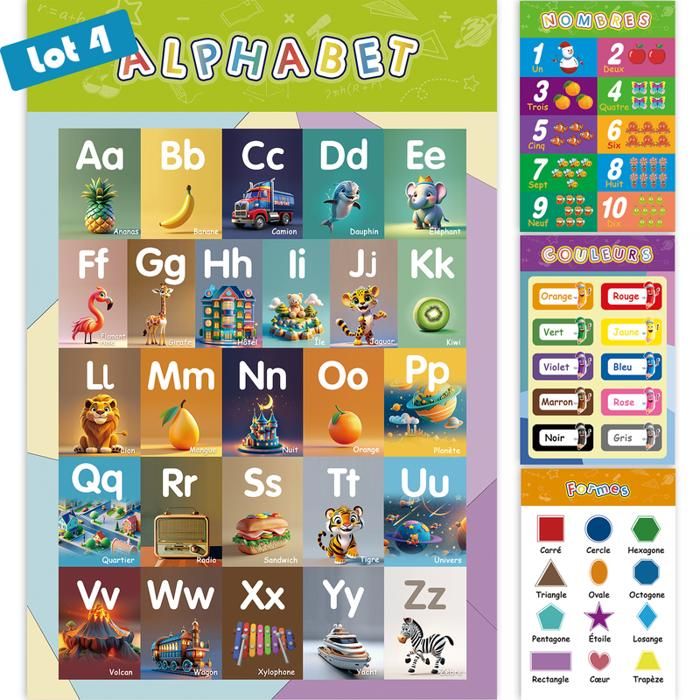 Lot de 4 Poster Alphabet Enfant42 * 28cm Affiches Alphabet Enfant Français avec Lettres,Apprendre ChiffresCouleursFormes