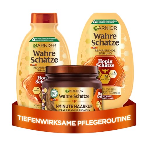 Garnier Wahre Schätze Lot de 3 accessoires de soin pour cheveux au miel d'acacia, manuka et lavande, shampoing miel (250 ml), après-shampoing 200 ml, cure 1 minute (340 ml)