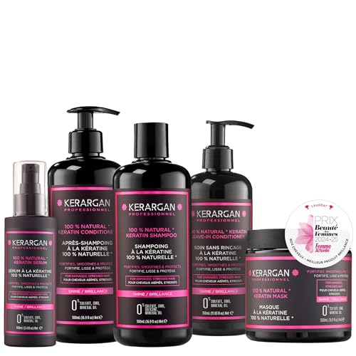 Kerargan - Ensemble Ultra Réparateur Shampoing, Après-shampoing, Masque, Sérum & Leave-In à la Kératine - Rénove & Protège Cheveux Abîmés - Sans Sulfate, OGM, Silicone - 3x500 ml + 100 ml + 350 ml