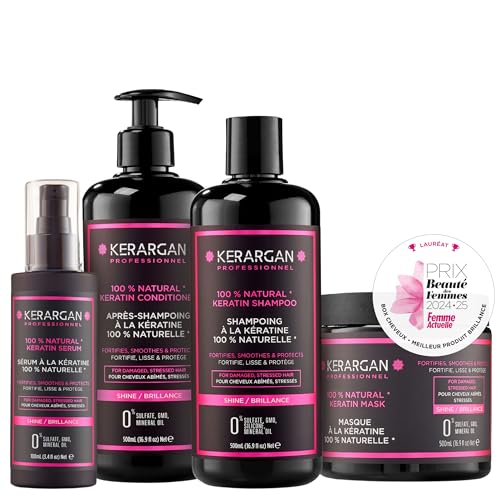 Kerargan - Ensemble Ultra Réparateur Shampoing, Après-shampoing, Masque & Sérum à la Kératine pour Cheveux Abîmés et Stressés - Revitalise & Protège - Sans Sulfate, OGM, Silicone - 3x500 ml + 100 ml