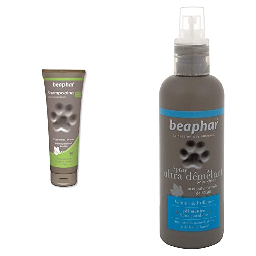 BEAPHAR – Shampoing Premium Doux Tous pelages pour Chien – 250ml & Spray Ultra-démêlant pour Chien – Extraits naturels d'Iris, de Lait de Karité et du polyphenol de Raisin 200 ML