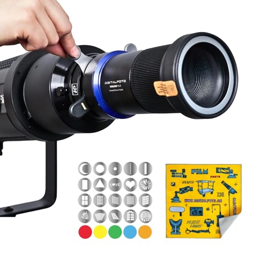 Spotlight Snoot Optique à Monture Bowens pour Aputure Amaran 60D/100D/150C/300C, 600X Pro, Ray 660C, Godox SL60 – Objectifs 33° Grand Angle / 16° Télé, LED Jusqu’à 300W, 20 Gobos & 5 Filtres Couleur