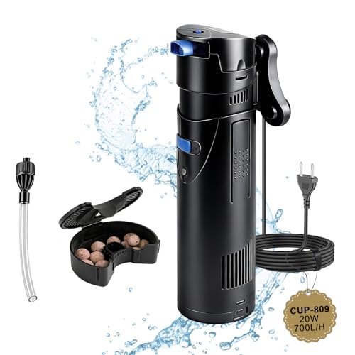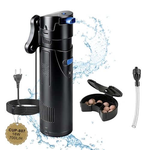 EXLECO Filtre Pompe Aquarium 4 en 1 avec Lampe UVC 7W, Bulleur Silencieux 700 L/h 18W, Anti Algues, Pompe a Air avec Écumeur, Éponge et Média, pour Bacs 150-300L, Aquariums Complets et Eau Douce