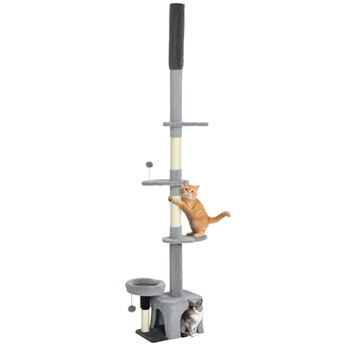 PawHut Arbre à Chat du Sol au Plafond, Hauteur 275 cm, Tour de Jeux pour Chat, 6 Niveaux, avec Plate-Formes, Niche, hamac, Balle, griffoirs, pour Grimper, gratter et Jouer, Gris Clair