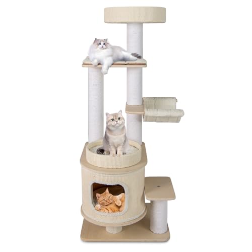 Taoqimiao Arbre a Chat, 170cm Arbre a Chat Maine Coon avec 2 Condos Spacieux pour Chats, 1 Confortable Hamac, 7 Griffers, 2 Plateformes, 1 Panier, Beige MS013M
