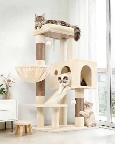Globlazer Arbre a Chat Beige 137 cm avec Très Gros Hamac 45 * 40cm, Grand Niches, Plateforme Rembourrés, Facile à Installer Arbres à Chats Intérieur pour Chats Adulte Repos Jeu Gratter (F53, Beige)