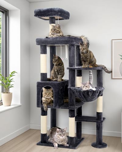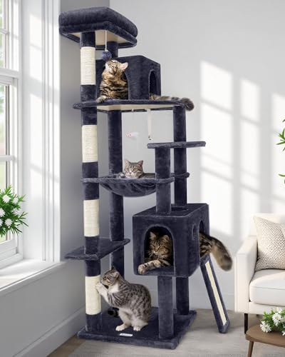 Globlazer Arbre a Chat Grand Hauteur 178 cm avec Doux Hamac, 2 Niches, Plateforme, Pente Sisal Peluche, Jouets, Arbres à Chat Coin Solide pour Gros Chats Repos Jeu Escalade (F70 Pro, Gris Foncé)